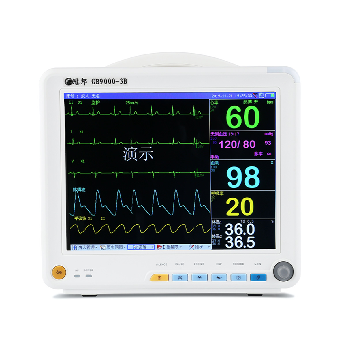 多參數(shù)監(jiān)護(hù)儀能為醫(yī)學(xué)臨床診斷提供重要的病人信息,通過各種功能模塊,可實(shí)時(shí)檢測人體的心電信號、心率、血氧飽和度、血壓、呼吸頻率和體溫等重要參數(shù),實(shí)現(xiàn)對各參數(shù)的監(jiān)督報(bào)警。信息存儲和傳輸,是一種監(jiān)護(hù)病人的重要設(shè)備。GB9000-3A多參數(shù)監(jiān)護(hù)儀適用于兒童和成人監(jiān)護(hù),可監(jiān)測參數(shù):心電、血氧飽和度、無創(chuàng)血壓、呼吸、體溫。